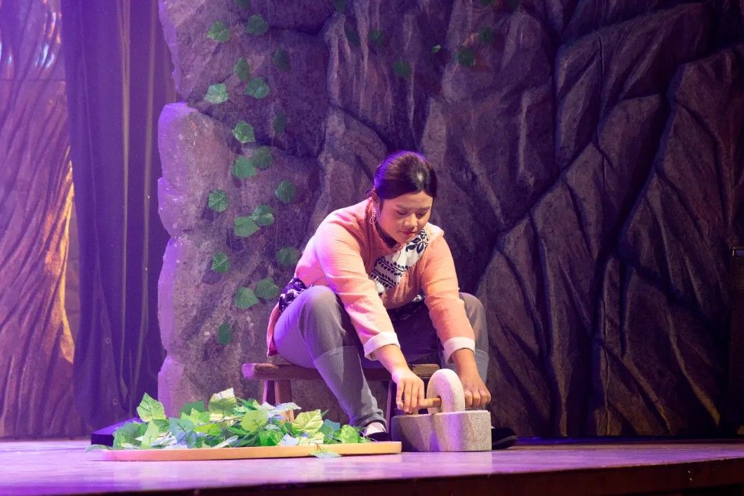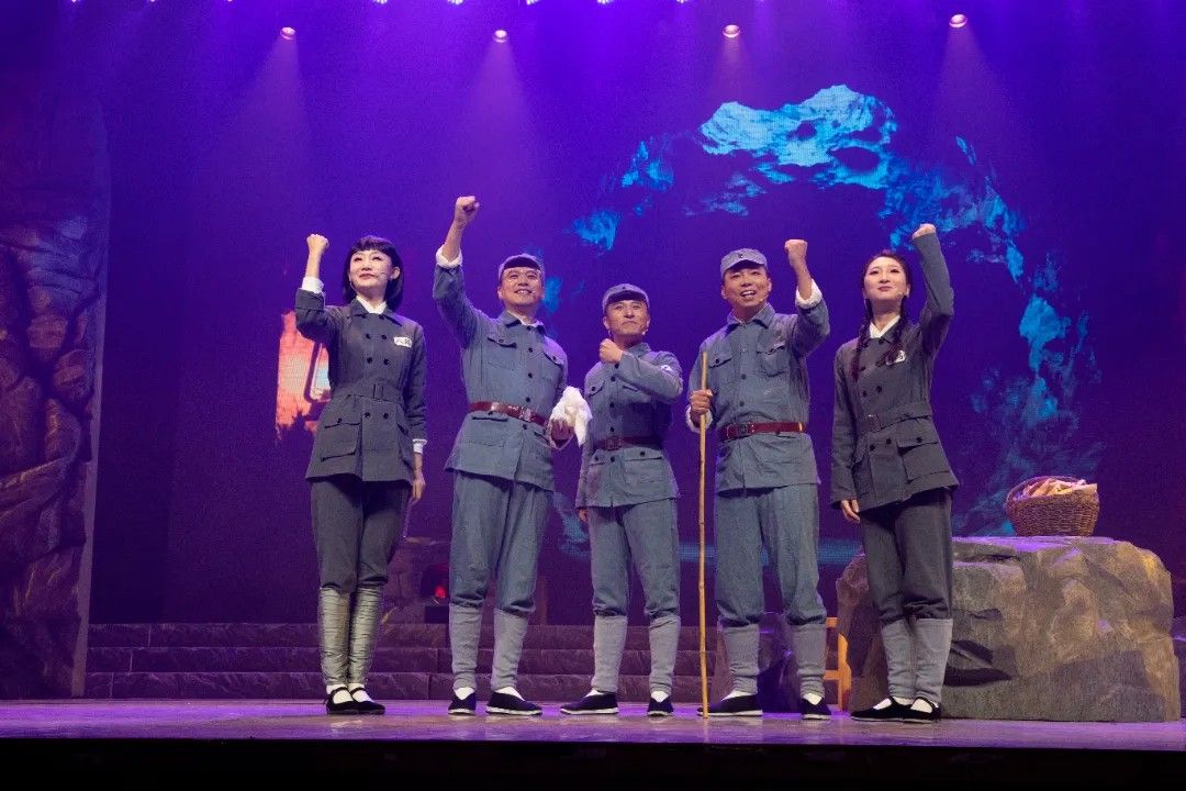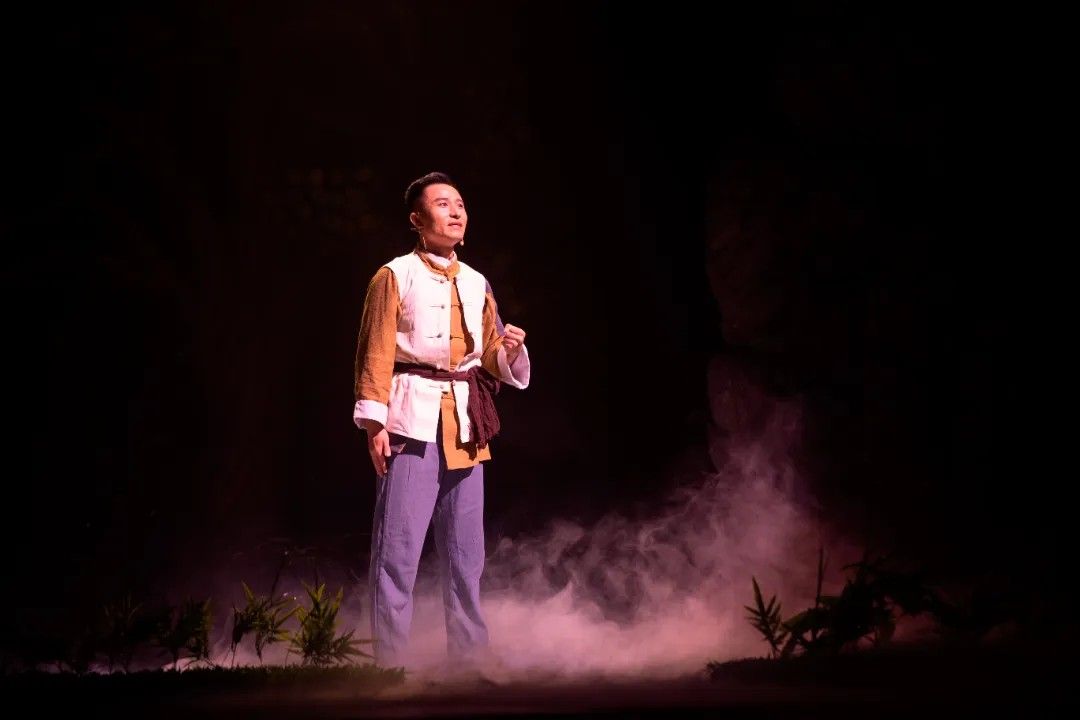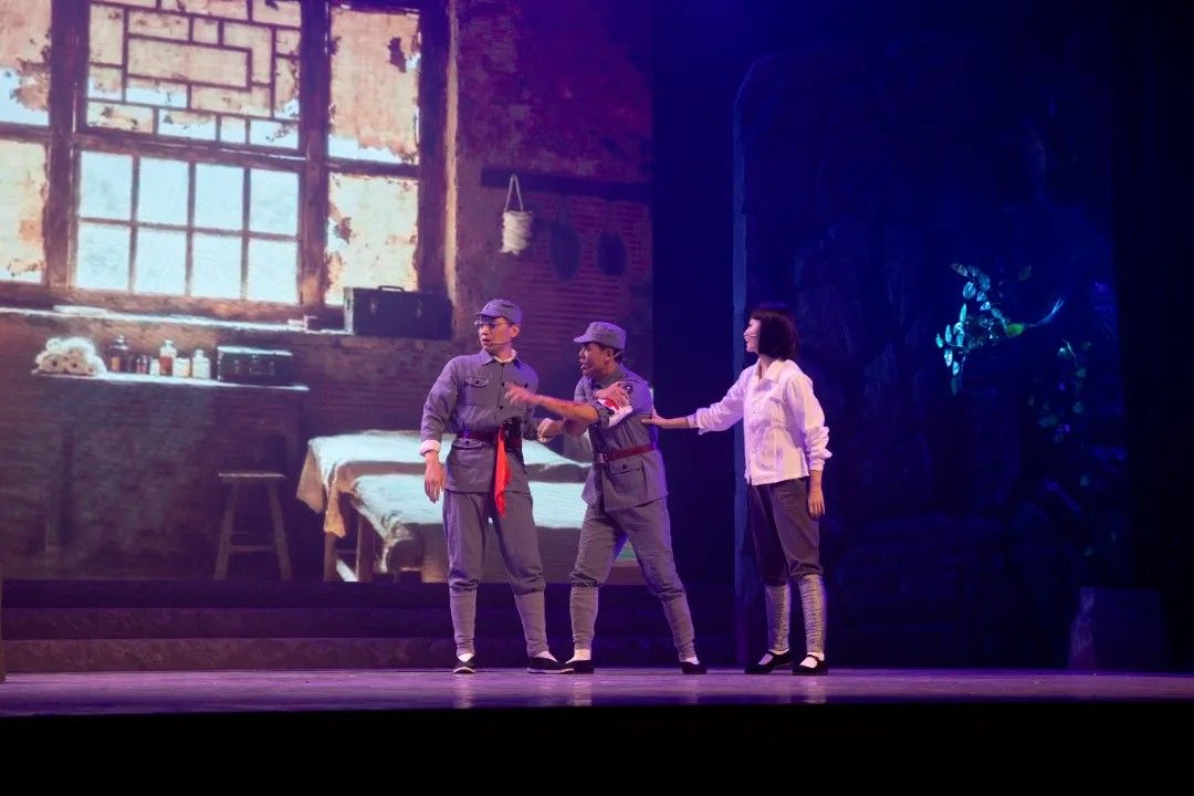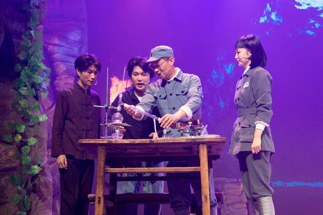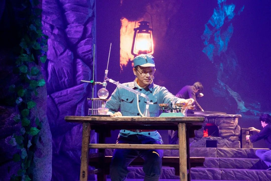 第二幕《寻着光亮的方向》中,舞台以四个光区呈现军民同心攻坚的场景。乡亲们与科研人员并肩作战,有人拉风箱化玻璃吹药瓶,有人碾磨草药、筛检药粉,老师傅锻造组装蒸馏设备。周济、白蔷薇等技术人员穿梭其间,与乡亲们以一口水、一句问候传递温情,在《大生产》旋律中,军民携手将“不可能”变为可能。